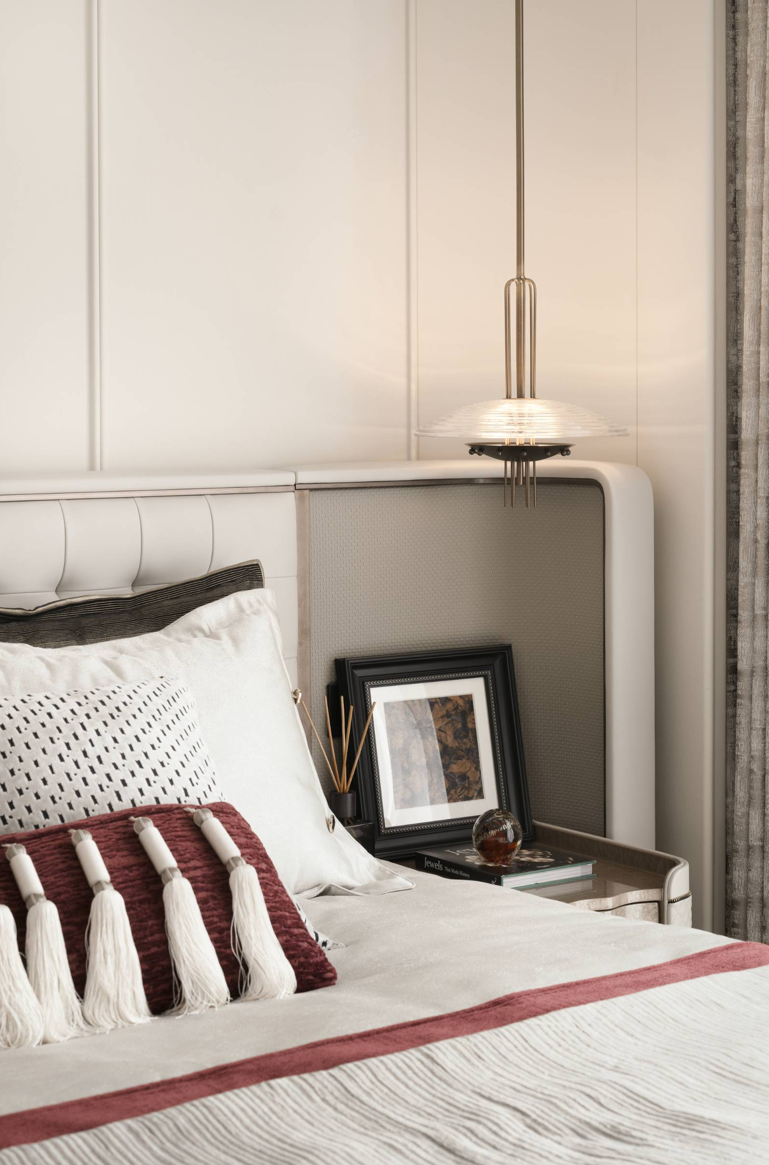 床品的细腻织物与木质床头柜的温润纹理,